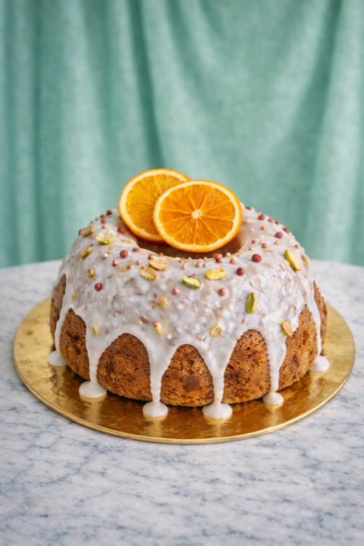 Ciasto drożdżowe ze skórką z pomarańczy, z lukrem. Nasączenie: sok z pomarańczy